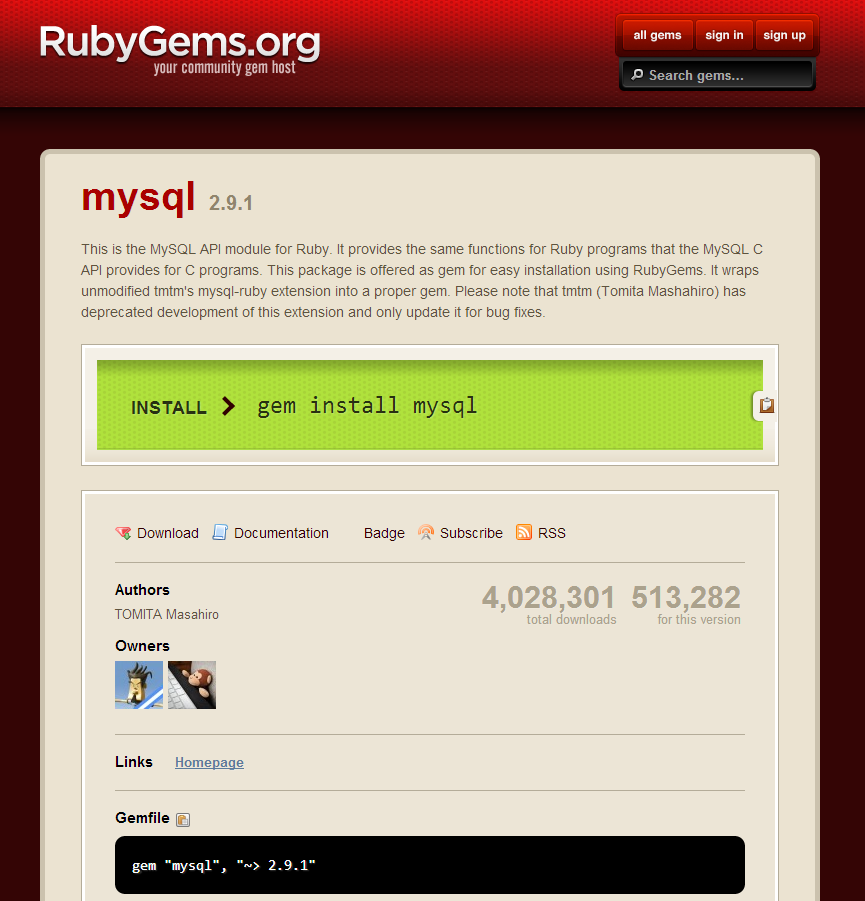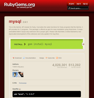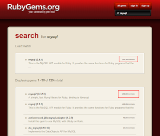 接看下載量,也不失為一個好方法 XD找到套件後,直接點進去,一定會先看到安裝路徑 gem install mysql 及這套件的相關資