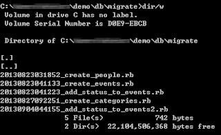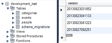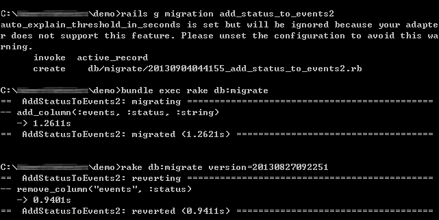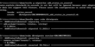 我在20130904044155_add_status_to_events2.rb 中,新增一個status欄位到events資料表內,當我指定回20130827092251這個版本,status欄位會自動被刪除。